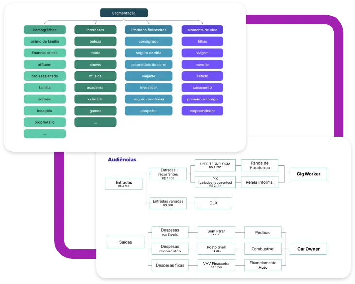 Sua audiência é segmentada, em tempo real, por +300 facetas de interesses, demográficas, produtos financeiros e momentos de vida.